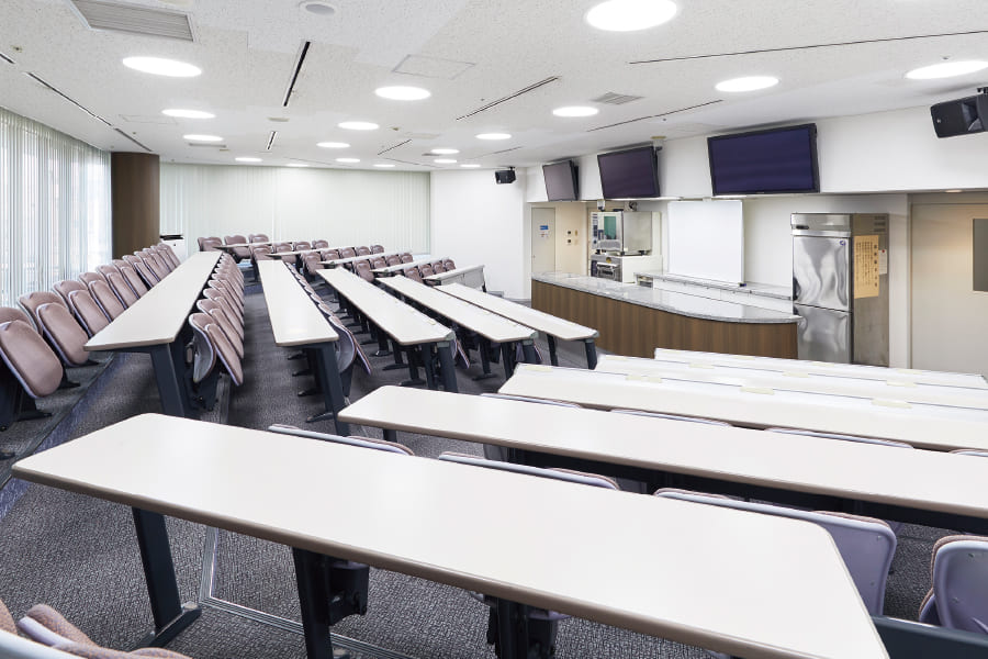 西洋料理・日本料理・中国料理すべての実習に対応します。55インチ大型モニターを2台設置。